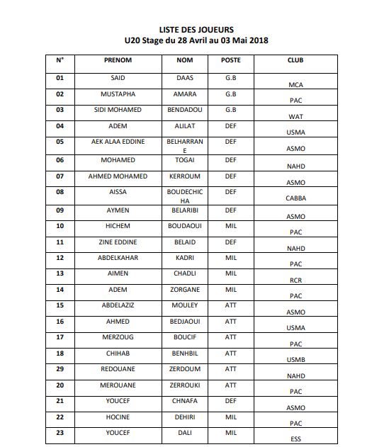 كما تم الكشف عن قائمة اللاعبين المعنيين بهذا التربص، والتي ضمت كل من: