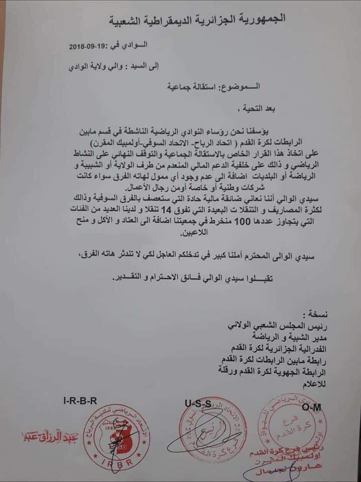 وأرسل رؤساء الأندية الثلاثة، نسخة عن استقالتهم هذه، لجميع الجهات المعنية، وطالبوا من خلالها والي ولاية الوادي، بالتدخل العاجل لإنقاذ أنديتهم.