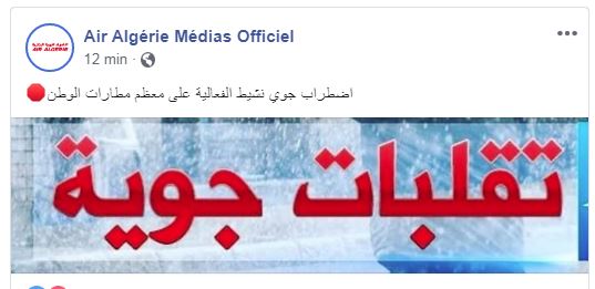 وقالت الجوية الجزائرية في منشور لها على صفحتها الرسمية في فايسبوك أن هناك اظطراب جوي نشيط الفعالية على معظم مطارات الوطن.