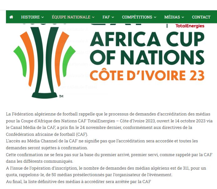 أعلنت الاتحادية الجزائرية لكرة القدم “فاف” عن انسحابها من عملية منح الإعتمادات للصحفيين، الخاصة بتغطية نهائيات كأس أمم إفريقيا بكوت ديفوار.