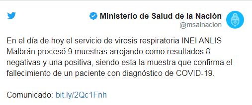 وقالت وزارة الصحة الأرجنتينية، في بين نشرته عبر موقعها الرسمي على تويتر، أن حالة الوفاة تتعلق برجل يبلغ من العمر 64 عاما.
