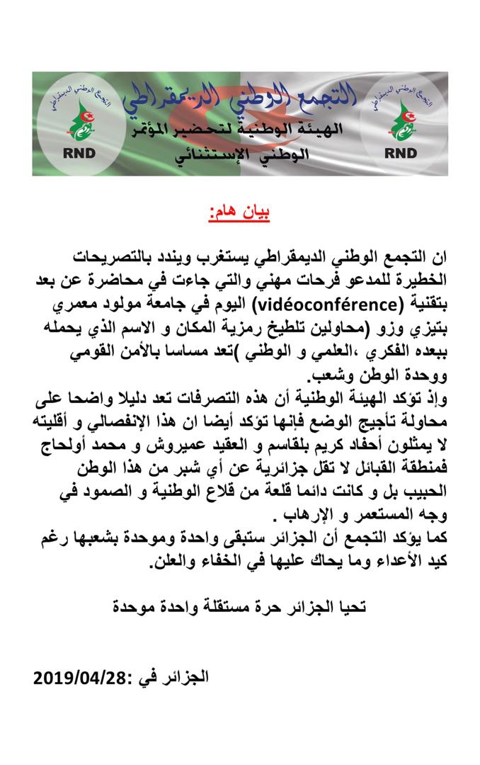 ندد حزب التجمع الوطني الديمقراطي بالتصريحات الخطيرة التي جاءت في محاضرة الإنفصالي فرحات مهني، وذلك عبر تقنية التحاضر عن بعد.
