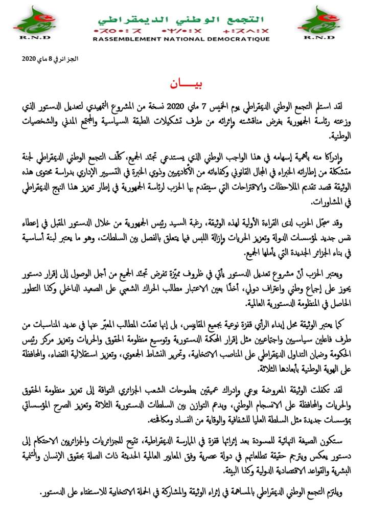 وأفاد التجمع الوطني الديمقراطي، في بيان له، أنه سجل لدى القراءة الأولية لهذه الوثيقة رغبة رئيس الجمهورية من خلال الدستور المقبل في إعطاء نفس جديد لمؤسسات الدولة وتعزيز الحريات وإزالة اللبس فيما يتعلق بالفصل بين السلطات .