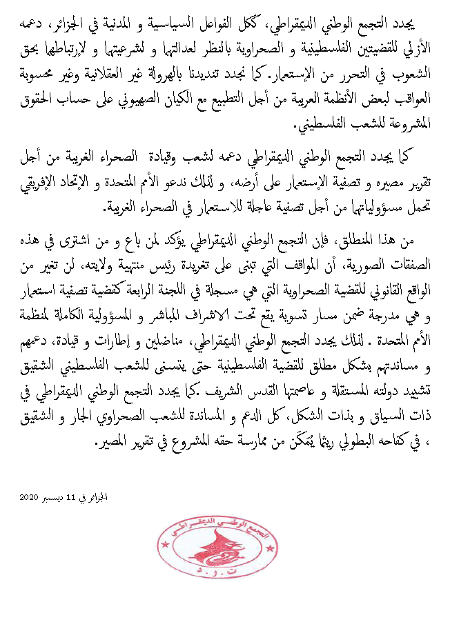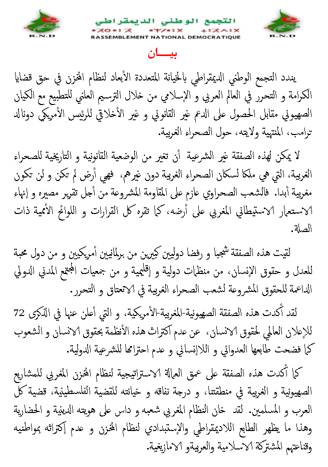 ندد حزب التجمع الوطني الديمقراطي، بالتطبيع المغربي مع الكيان الصهيوني، والذي أعلن عنه الرئيس الأمريكي المنتهية عهدته دونالد ترامب.