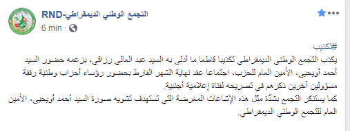 كذّب حزب التجمع الوطني الديمقراطي ، ما أدلى به المحلل السياسي عبد العالي رزاقي ، حول حضور الأمين العام للارندي أحمد أويحيى، اجتماعا عقد نهاية الشهر الفارط.