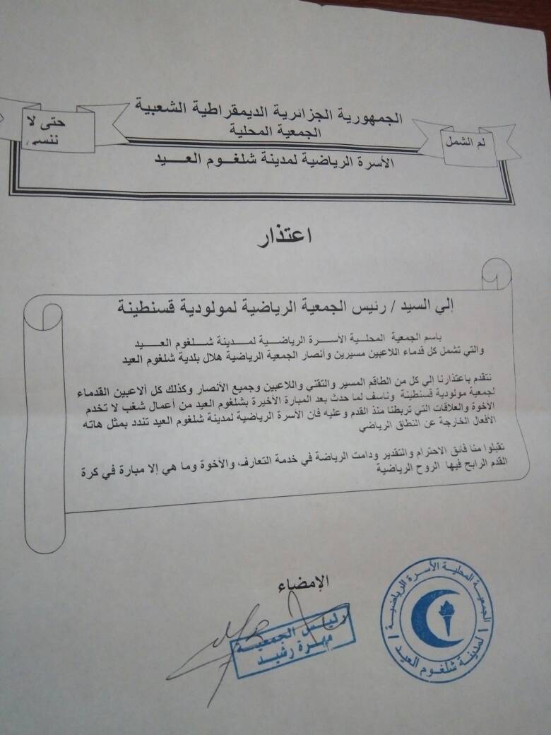 ولذلك بادرت الأسرة الرياضة لنادي شلغوم العيد بالإعتذار لإدارة وأنصار مولودية قسنطينة.