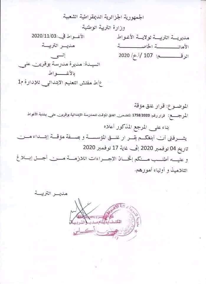 أصدرت مديرية التربية بولاية الأغواط بيانا حول غلق مؤقت لإبتدائية بوڨرين علي بعد ثبوت إصابة طاقمها بفيروس كورونا.