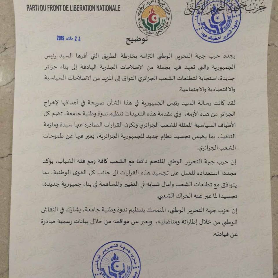 الأفلان .. نحن مع الحراك وندعم مبادرة الرئيس بوتفليقة