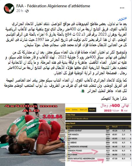 مبرزة بأن ما يؤكد بأنها لم تخطئ، هو النتيجة التاريخية التي حققها الرباعي حمادة فؤاد وقواند محمد علي وسجاتي جمال ومولا سليمان. في نهائي التتابع أربعة مرات 400 متر رجال. وأن مصلحة الجزائر والراية الوطنية فوق كل اعتبار.