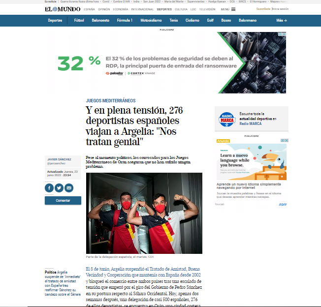 أشاد الإعلام الإسباني. بالإستقبال والمعاملة الجيدة. التي تلقاها الوفد الإسباني المشارك في الألعاب المتوسطية وهران 2022.
