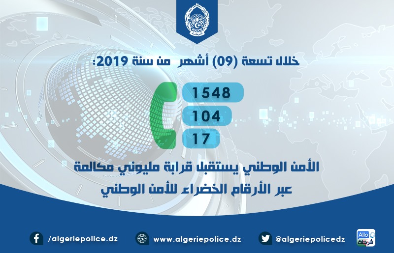 كشفت المديرية العامة للأمن الوطني أن مركز القيادة والعمليات التابع لها سجل ، 1979681 مكالمة عبر الأرقم الأخضراء خلال تسعة أشهر من سنة 2019.