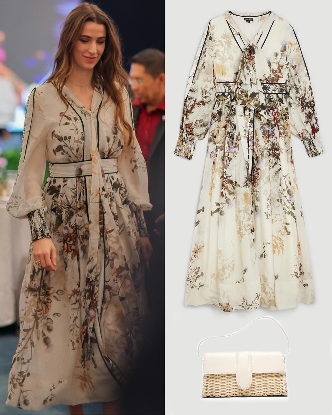 وجاءت قصّة الفستان طويلة بالتنورة الكلوش مع الأكمام الطويلة المزمومة في نهايتها، وربطة العنق المعقودة من الأمام. وتوسطه الحزام العريض من نفس خامة الفستان.