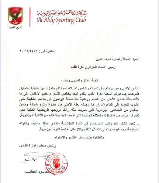 تقدمت إدارة الأهلي المصري بشكر وعرفان للإتحاد الجزائري لكرة القدم  بخالص الشكر  على ما لاقته من ترحاب ورعاية منذ لحظة وصول الفريق الى الجزائر.