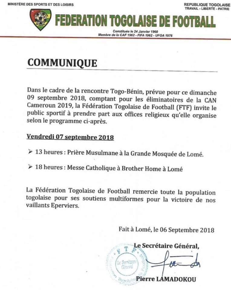 دعا الإتحاد الطوغولي لكرة القدم في بيان رسمي له، اليوم الخميس، جماهيره من مسلمين وكاثوليك للصلاة قبل لقائه أمام منتخب البنين.