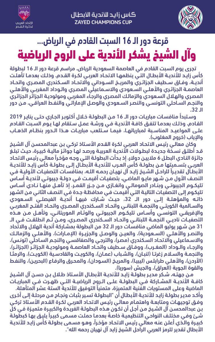 وأعلن الإتحاد العربي لكرة القدم، عن إجراء قرعة الدور الـ16 من البطولة العربية للأندية، يوم السبت المقبل، بالعاصمة السعودية الرياض.
