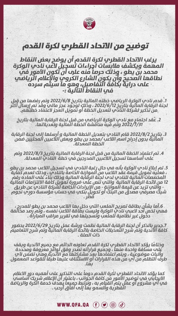 وجاء في بيان الإتحاد القطري لكرة القدم، اليوم الخميس، عبر حسابه لتويتر:”يرغب الإتحاد القطري لكرة القدم، أن يوضح بعض النقاط، ويكشف ملابسات إجراءات تسجيل لاعب الوكرة محمد بن يطو”.