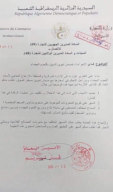 وجهت وزارة التجارة، اليوم الثلاثاء، مراسلة إلى المديرين الجهوين للتجارة من أجل تحديد الأسباب التي ادت الى الارتفاع المفاجئ لأسعار اللحوم البيضاء.
