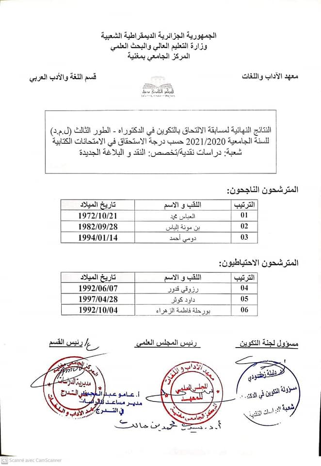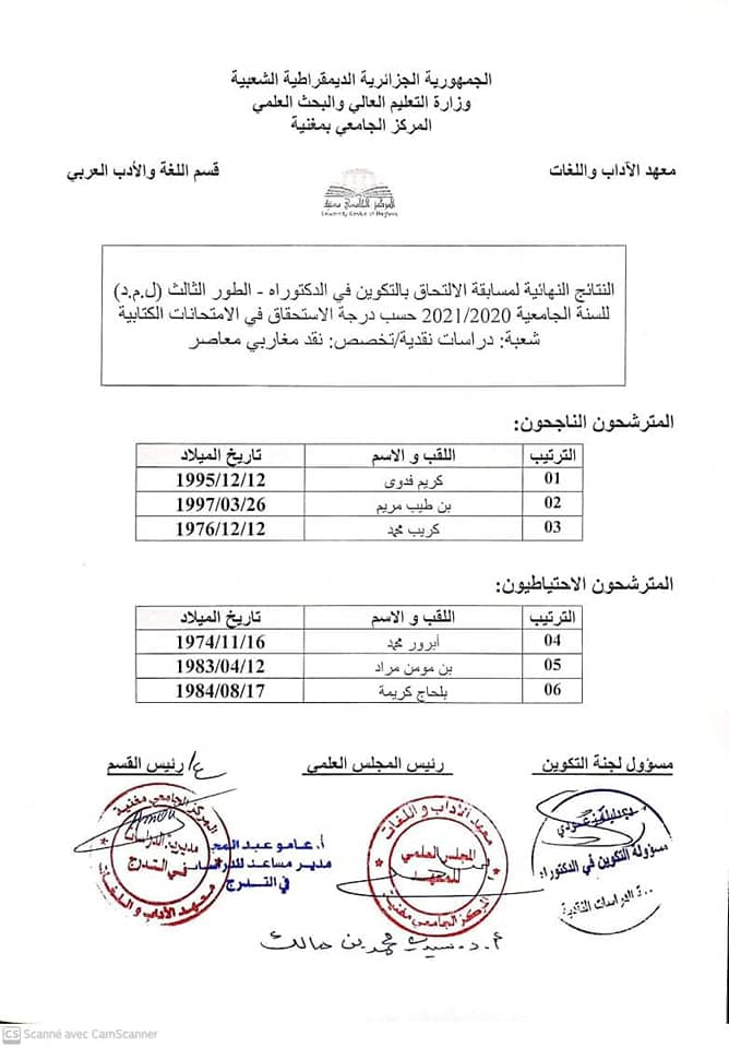 أعلن المركز الجامعي لمغنية، ليلة أمس السبت، عن النتائج النهائية لمسابقة الدكتوراه 2020/2021 شعبة الدراسات النقدية.