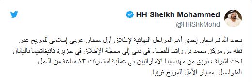 وكتب رئيس دولة الإمارات، في تغريدة له عبر موقعه الرسمي على تويتر، “الحمد الله تم انجاز إحدى أهم المراحل النهائية لإطلاق أول مسبار عربي إسلامي للمريخ”.
