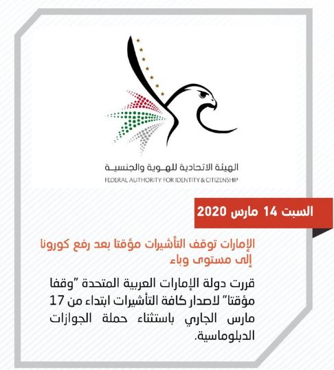 أعلنت دولة الإمارات، اليوم السبت، عن قرار توقيف إصدار كافة التأشيرات مؤقتا ابتداء من تاريخ الـ17 مارس الجاري، بسبب تفشي فيروس كورونا.