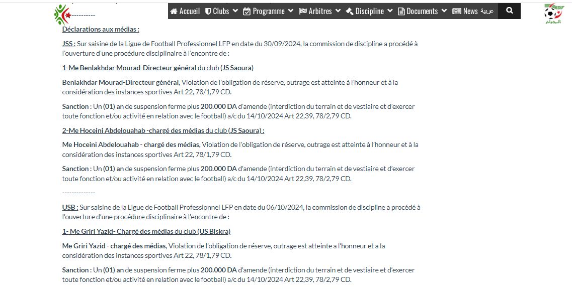 أنزلت لجنة الانضباط التابعة للرابطة المحترفة لكرة القدم، عقوبات قاسية في حق مسؤولين من شبيبة الساورة، واتحاد بسكرة، بسبب تصريحاتهم الإعلامية، في حق رسميين.