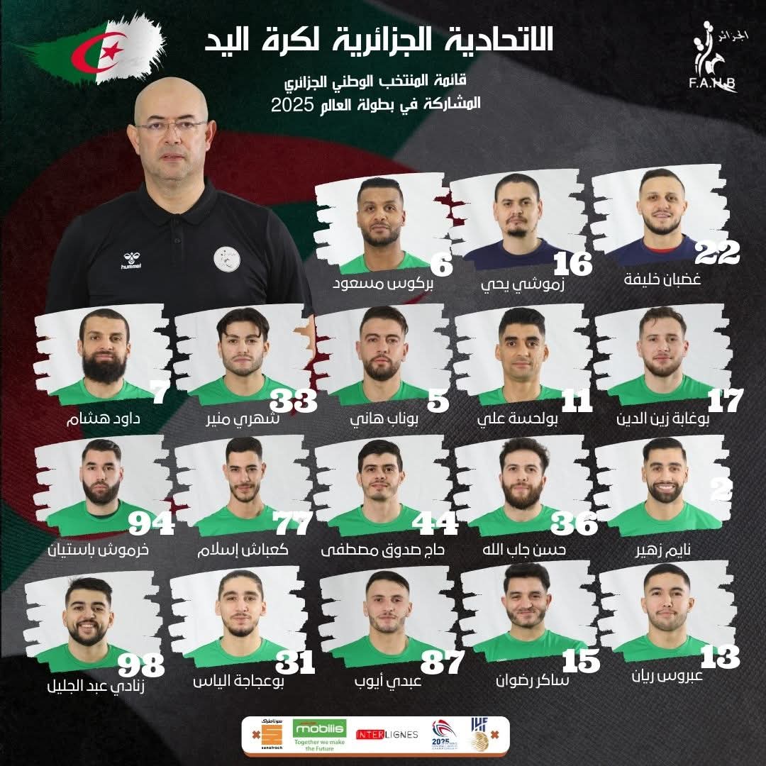 ونشر الاتحاد الجزائري لكرة اليد، عبر صفحته على فيسبوك، قائمة تضم 18 لاعباً، سيمثّلون الألوان الوطنية في هذه البطولة العالمية.