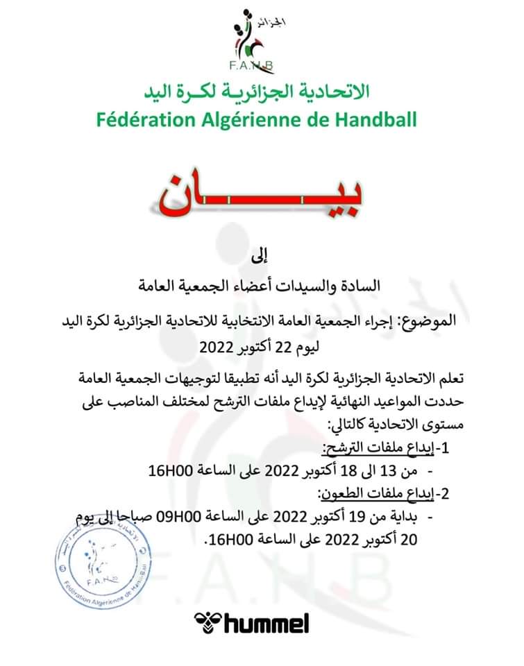 كشف الاتحاد الجزائري لكرة اليد، التاريخ المحدد لانعقاد جمعيته العامة الإنتخابية، بالإضافة لموعد ايداع الترشحات، وملفات الطعون.