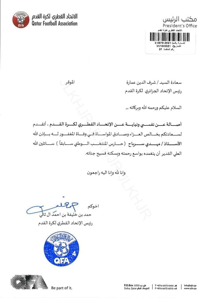 ودعى رئيس الاتحاد القطري لكرة القدم، المولى عزّ وجل، أن يتغمد فقيد كرة القدم الجزائرية، برحمته الواسعة، وأن يلهم ذويه الصبر والسلوان.