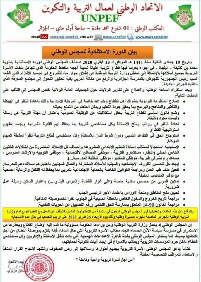 وقال بيان “الانباف” بعد اجتماع الدولة الاستثنائية للمجلس الوطني المنعقدة أمس بالبليدة ، قررت النقابة الوطنية لعمال التربية والتكوين يوم إحتجاجي في كامل المؤسسات التربوية وطنيا مع وقفة وطنية أمام وزارة التربية الوطنية متبوعة بمسيرة إلى العاصمة.
