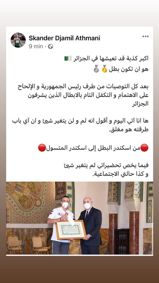 الرياضي البارالمبي نشر منشور على صفحته الشخصية في موقع التواصل الاجتماعي “فايسبوك” وصف فيه نفسه بالمتسول.