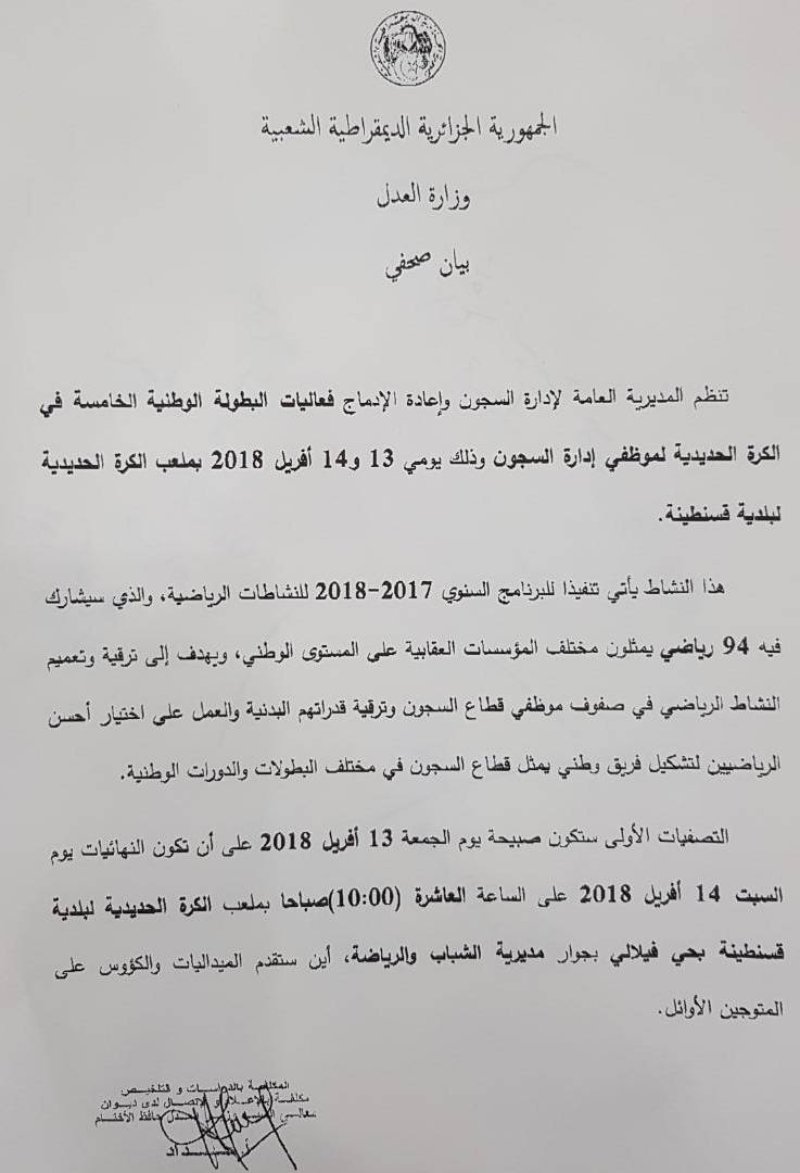 تنظم المديرية العامة لإدارة السجون وإعادة الإدماج فعاليات البطولة الوطنية الخامسة في الكرة الحديدية لموظفي إدارة السجون.
