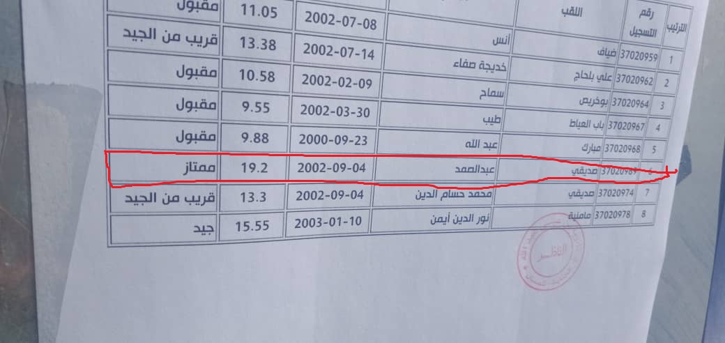 وبلغ معدل التلميذ صديقي عبد الصمد، في شهادة البكالوريا 19.20 شعبة تقني رياضي في ثانوية عبد الله بن عيسى الحناية.