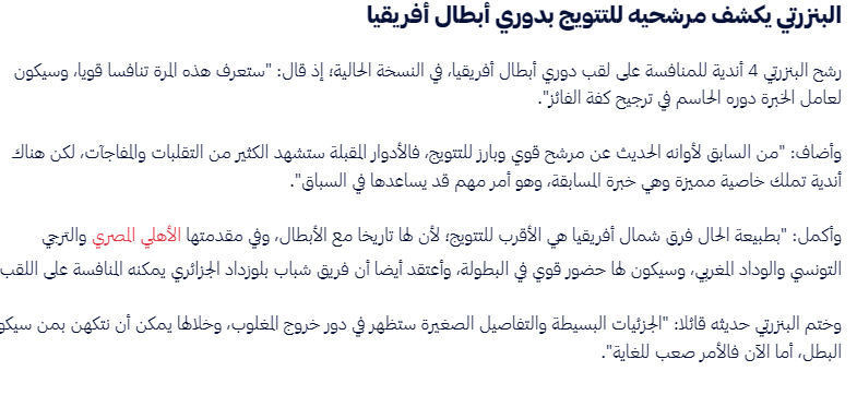وقال البنزرتي في حواره لموقع “win win” العربي عن إمكانية تتويج بلوزداد باللقب “أعتقد آن شباب بلوزداد يمكنه المنافسة اللقب، كما أن فرق شمال إفريقيا هي الأقرب للتتويج في مقدمتها الأهلي والترجي والوداد”.