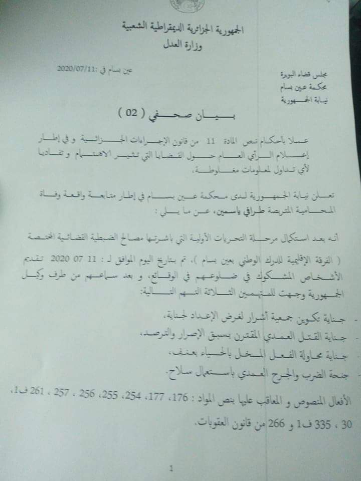 أمر قاضي التحقيق بمحكمة عين بسام في البويرة اليوم السبت بإيداع 3 متهمين في قضية مقتل المحامية المتربصة طرافي ياسمين المقتولة الحبس المؤقت.
