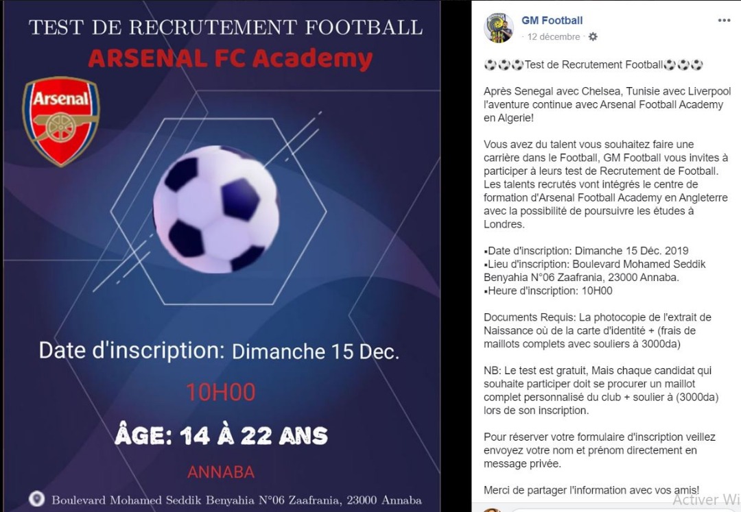 ليخصص المكتب لإستقبال ملفات الشباب البالغين من العمر بين 14 و22 سنة المنحدرين من ولايات الشرق الجزائري، والراغبين في الإلتحاق هذه السنة بأكاديمية فريق “أرسنال” الإنجليزي.