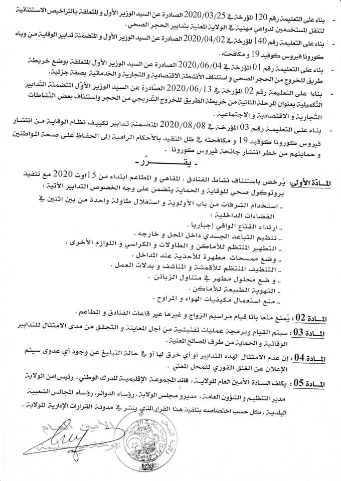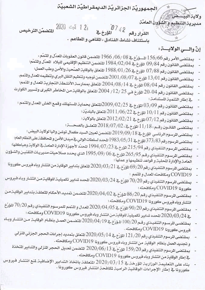 أصدر والي ولاية البيض قرار يتضمن الترخيص بإستئناف نشاط الفنادق المقاهي والمطاعم على مستوى إقليم الولاية.
