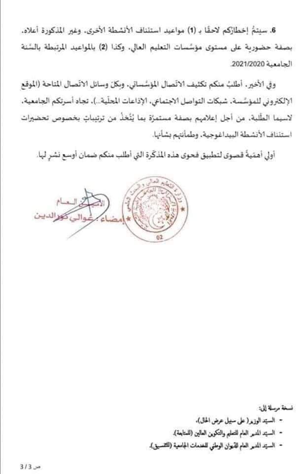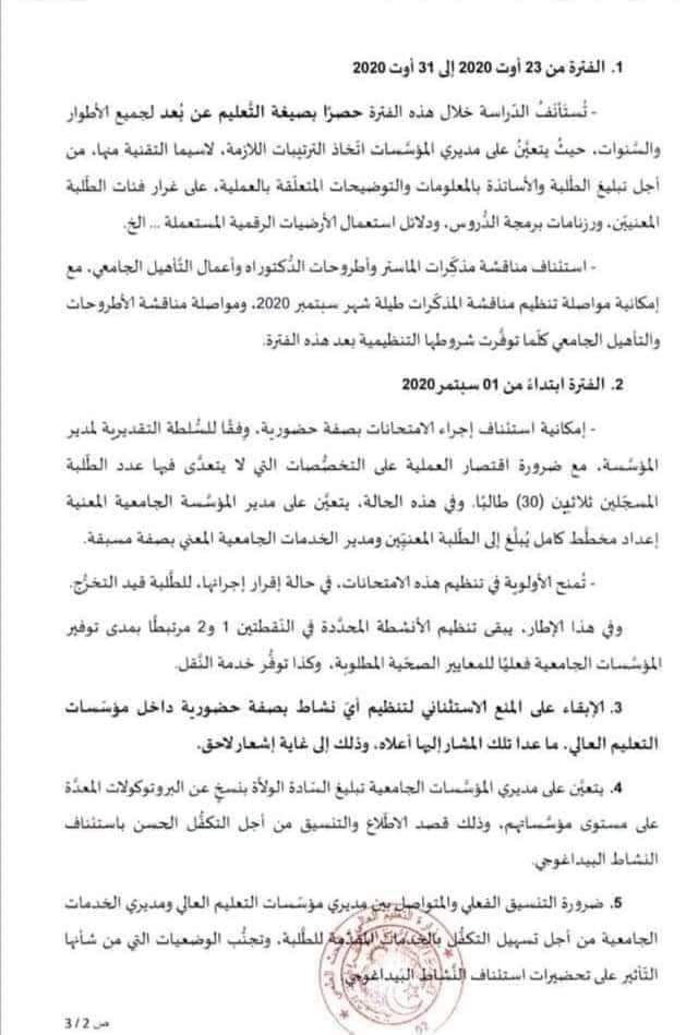 كما أكدت ذات المذكرة على الإبقاء على المنع الإستثنائي لتنظيم أي نشاط بصفة حضورية داخل مؤسسات التعليم ما، تلك المشار إليها اعلاه وذلك إلى غاية اشعار آخر.