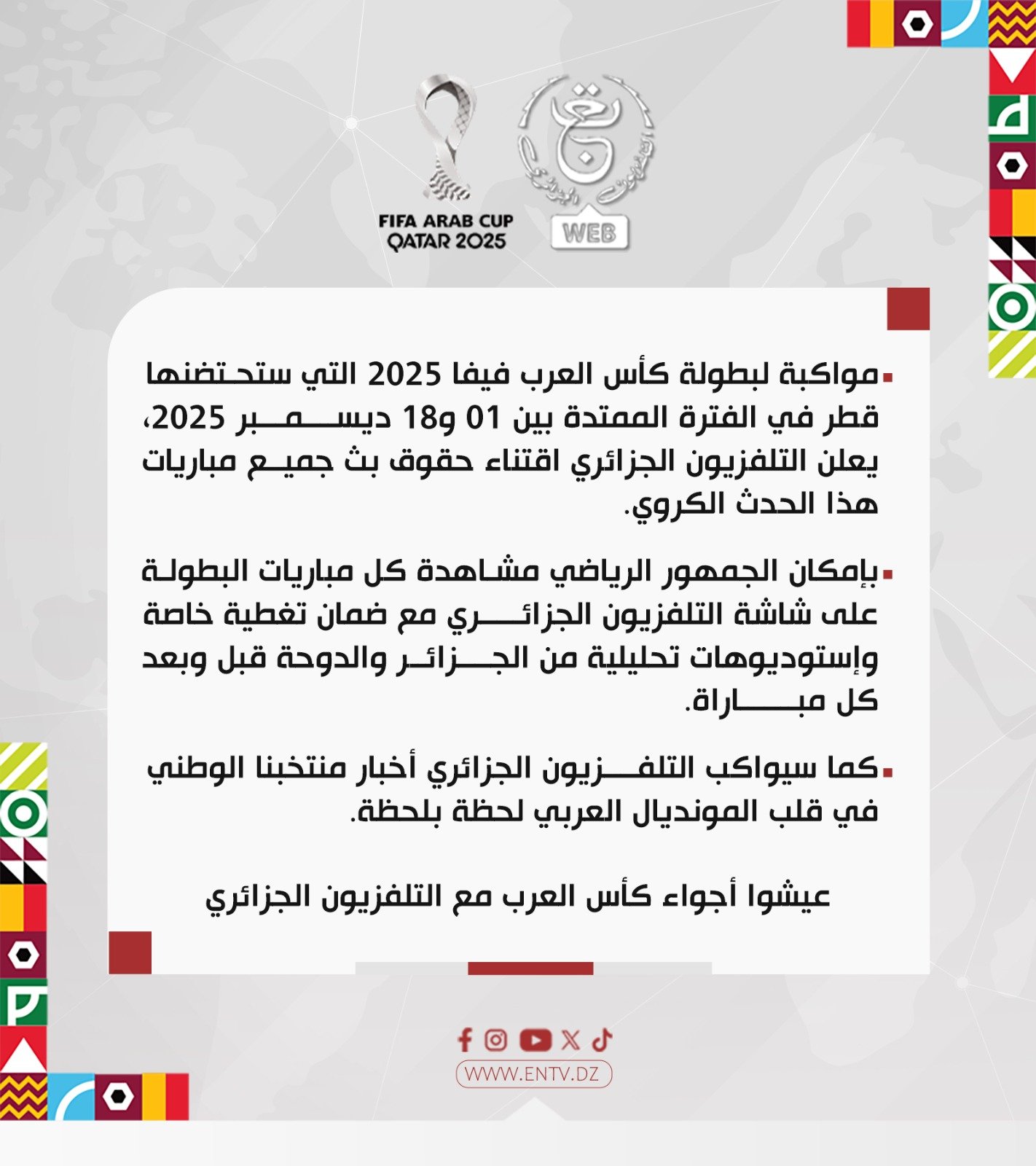 وختمت المؤسسة بيانها بدعوة الجماهير للاستمتاع بأجواء كأس العرب عبر قنوات التلفزيون الجزائري طيلة فترة البطولة.