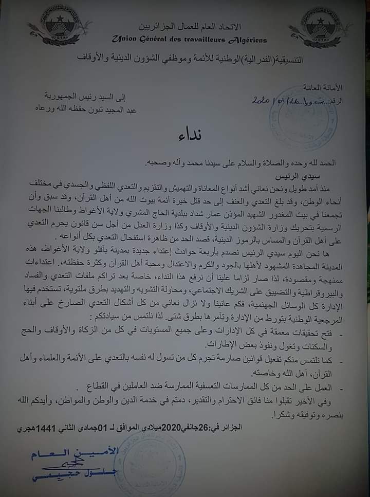 وجهت التنسيقة الوطنية للأئمة وموظفي الشؤون الدينية والأوقاف، اليوم الأحد في بيان لها، نداء إستغاثة لرئيس الجمهورية، عبد المجيد تبون.
