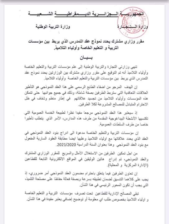 وحسب ذات الوزارة فإن المقرر الوزاري المشترك يحدد نموذج عقد التمدرس الذي يربط بين المؤسسات التربية والتعليم الخاصة وأولياء التلاميذ.