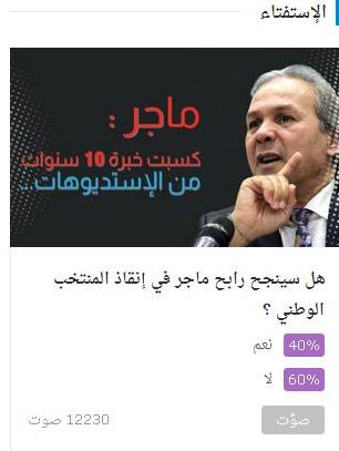 وصوّت 60 بالمائة على أن ماجر لن ينجح في هذه المهمة و40 بالمائة صوتوا بنعم.