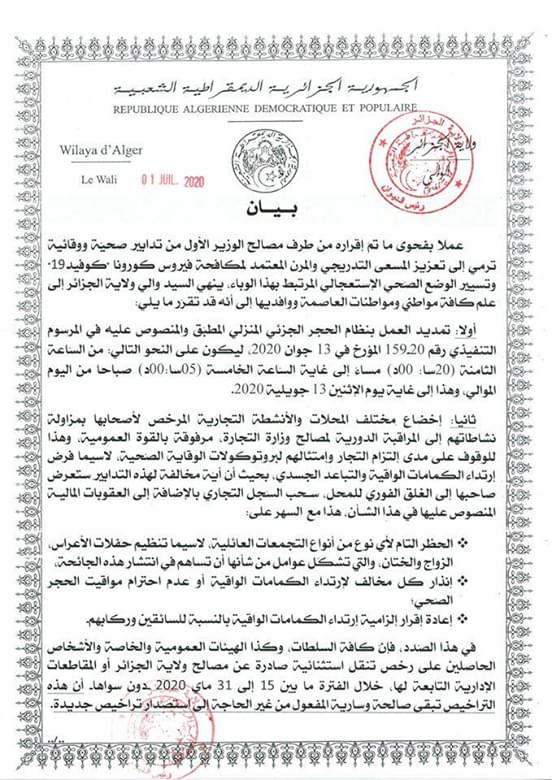 وأفاد والي ولاية الجزائر العاصمة، في بيان نشرته مصالح الولائية، أنه تقرر تمديد العمل بنظام الحجر الجزئي المنزلي المطبق والمنصوص عليه في المرسوم التنفيذي رقم 20. 159 المؤرخ يوم 13 جوان 2020.
