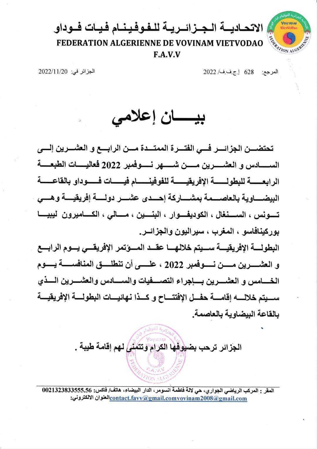 الجزائر تحتضن البطولة الإفريقية للفوفينام فيات فوداو من 24 إلى 26 نوفمبر