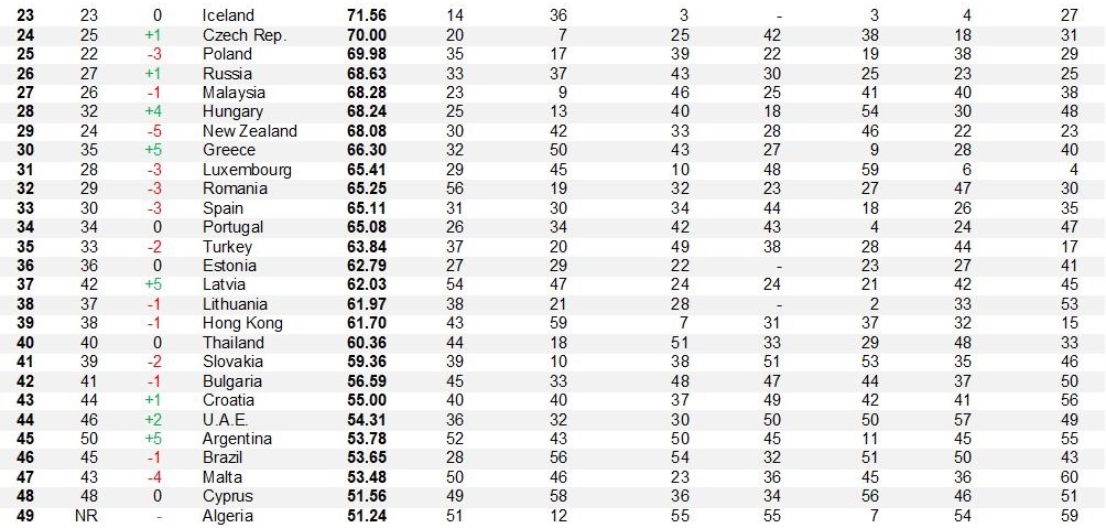 وأوضح المؤشر أن الجزائر حلت في المرتبة 49 عالميا، من بين قائمة تضم 60 دولة.