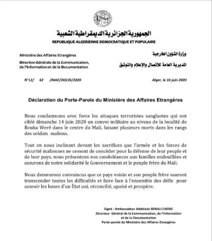 وأفادت وزارة الخارجية، اليوم الثلاثاء في بيان لها، أن الجزائر تدين بشدة الهجمات الإرهابية التي إستهدفت يوم الأحد الماضي قافلة عسكرية بمنطقة بوكا ويري وسط مالي، والذي خلف مقتل عشرات الجنود.