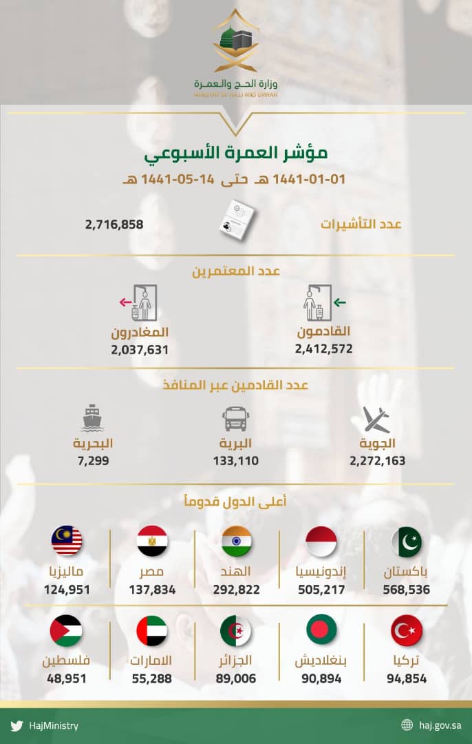 وأوضحت وزارة الحج والعمرة السعودية، إنه أصدرت أكثر من 2.7 مليون تأشيرة عمرة ووصول أكثر من 2.4 مليون معتمر إلى المملكة لأداء مناسك العمرة.