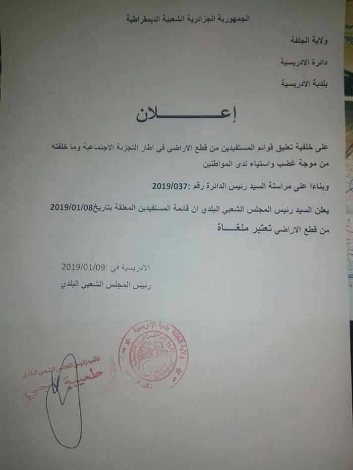 ألغى رئيس المجلس الشعبي البلدي، ببلدية الإدريسية في ولاية الجلفة، اليوم الأربعاء، قائمة المستفيدين من القطع الأرضية الفلاحية لذات البلدية.