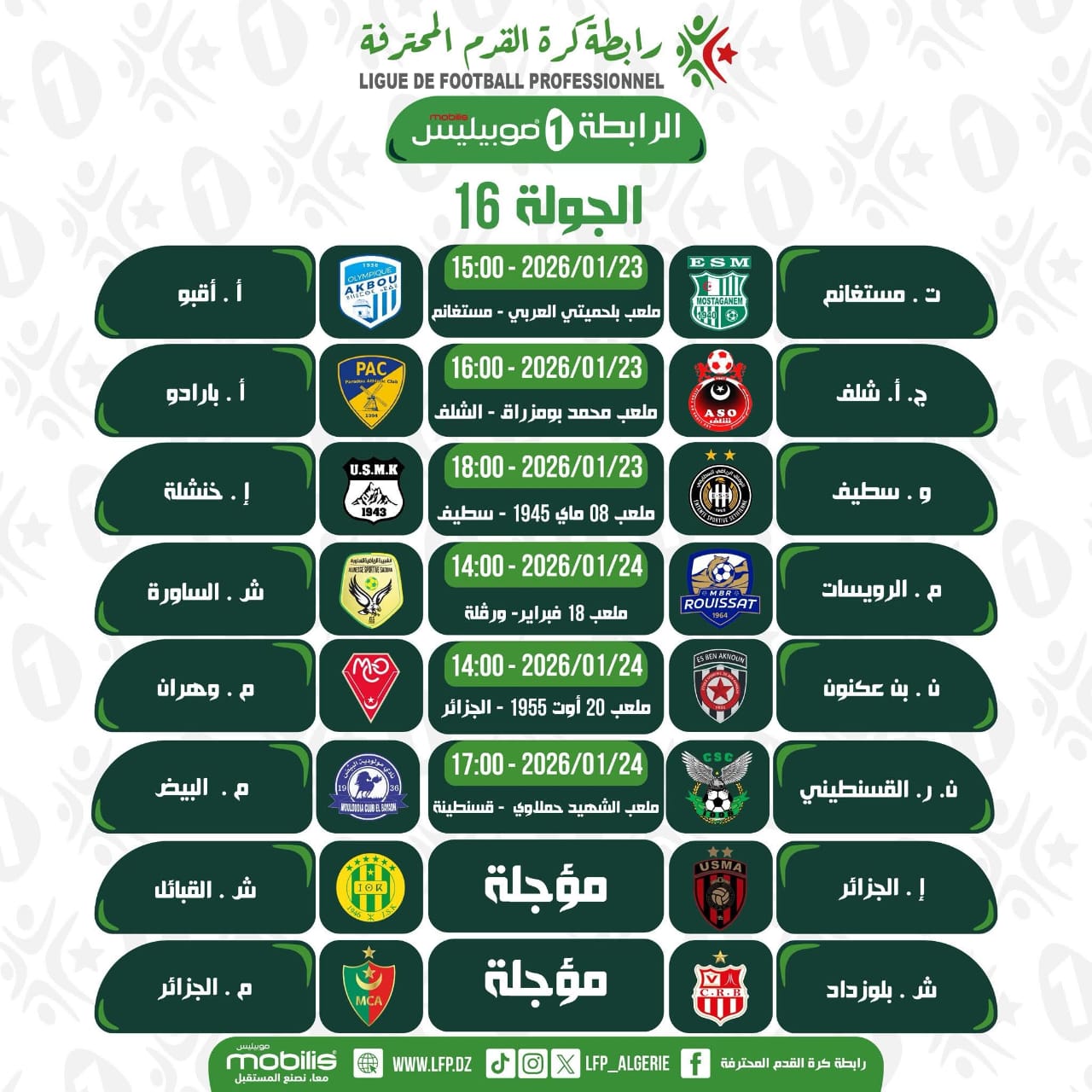 الجولة 16.. تأجيل داربي “السياربي” والمولودية وكلاسيكو اتحاد العاصمة – شبيبة القبائل
