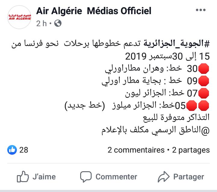 وأضافت الجوية الجزائرية في ذات البيان أنها افتتحت خطا جديدا ببرمجة 5 رحلات نحو ميلوز بين 15 و 30 سبتمبر.