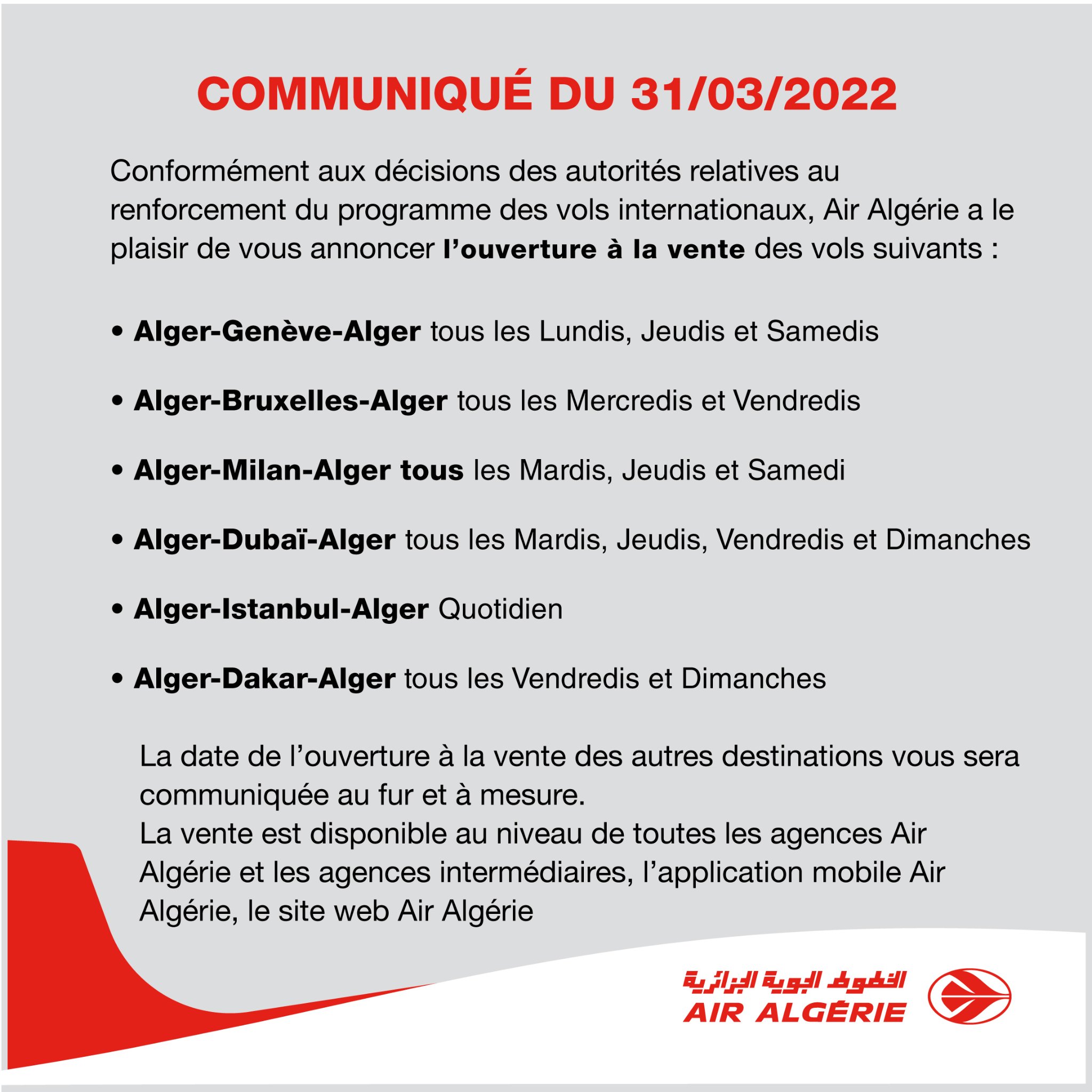 كما أكدت air algérie أن البيع متاح في جميع وكالات ووكالات الخطوط الجوية الجزائرية ، وتطبيق الهاتف الجوال للخطوط الجوية الجزائرية ، وموقع الخطوط الجوية الجزائرية.